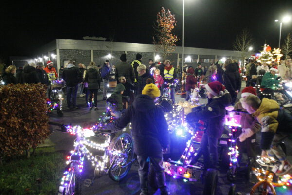 ‘Geen elektrische voertuigen’, zo luidt de regel op de uitnodigende poster die via de social media is verspreid, maar in een wereld van e-bikes en fatbikes is deze regel niet te handhaven en niemand doet er moeilijk over. Tientallen rijwielen met ondersteuning rijden dan ook mee in de stoet en ook scootmobielen en steps met een motortje nemen volop deel aan de lichtjesoptocht.