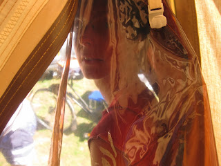 Of hij wel weet hoe deze geleende kampeeruitrusting opgebouwd moet worden, vraag ik hem onderweg. Zijn antwoord overtuigt me niet echt van zijn vakkundigheid en nadat we het systeem op de plaats van bestemming hebben uitgeklapt blijkt al snel dat hij er geen snars verstand van heeft. Daar staan we dan tussen enorm veel tentstokken en een doek dat de vorm van een tent moet gaan krijgen.