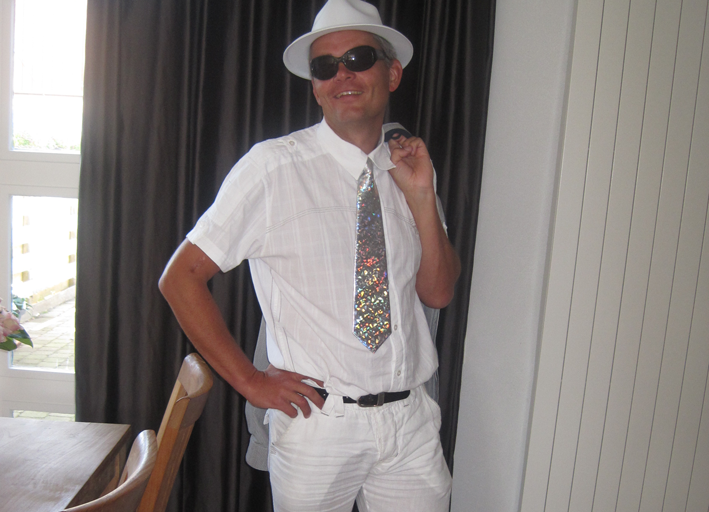 Tja, hoe pak je dat aan, zo is mijn eerste gedachte bij het zien van de uitnodiging. Op zolder had ik al gezocht in mijn feest-neuzen-doosje maar was niets te vinden dat aan mijn eisen voldeed. Navraag bij wat mensen om me heen leverde ook al weinig op en dus maar op naar de plaatselijke feestwinkel. De glitterende stropdas is één van de eerste dingen ik geschikt acht en samen met mijn witte kleding lijkt het vast al heel wat.