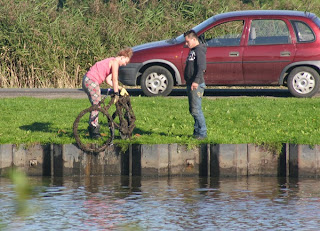 Maar dan… dan wordt er een fiets aan de haak geslagen en als flinke buit in de aanhanger gedeponeerd en even later nog een aantal zware metalen voorwerpen. Eindelijk hebben we het antwoord: ze zijn gewoon aan het dreggen naar oud ijzer. Ons gesprek is daarmee echter niet afgesloten, maar begint weer van vooraf aan. Zouden ze voor het vissen naar oud ijzer ook een visvergunning nodig hebben?